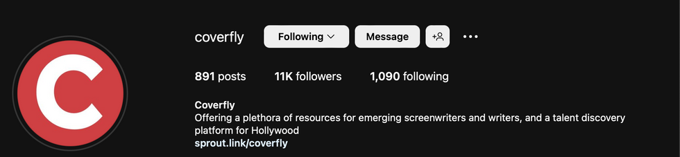 A picture of the Instagram bios of "Outstanding Screenplays," "Screencraft," and "Coverfly" pulled directly from their instagram accounts.